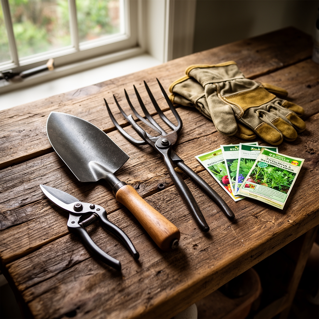 - Broadfork or spading fork (preservation of soil structure)